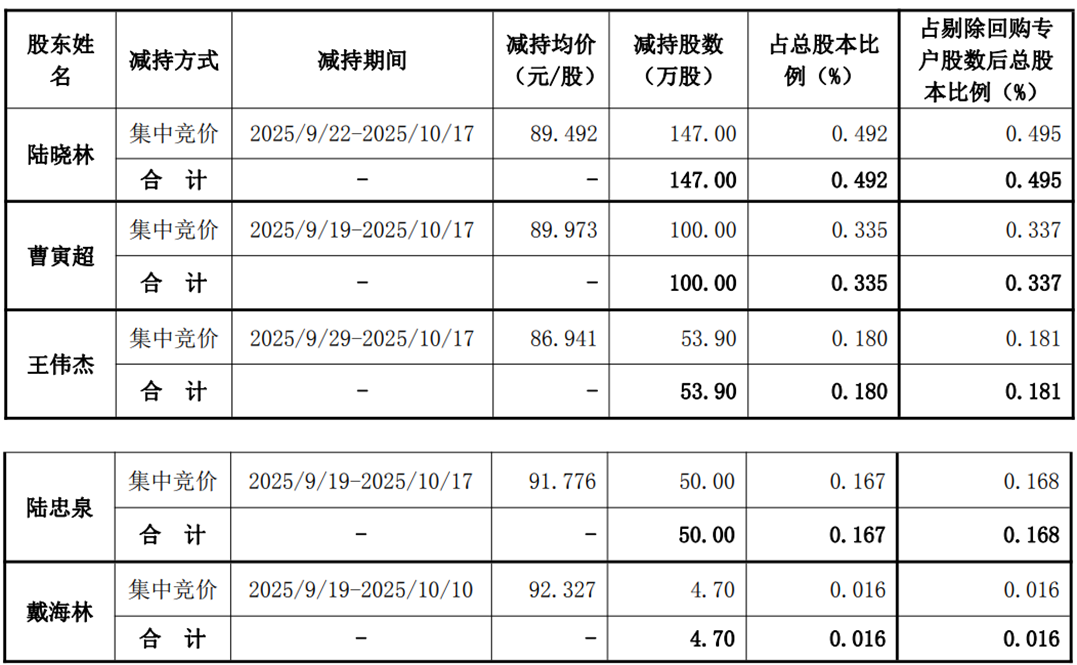 中国经济网北京11月14日电 长盛轴承(300718.SZ)昨日发布关于实际控制人一致行动人减持股份的预披露公告。孙伟庆先生直接持有公司股份44,550,000股(占公司股份总数的14.91%;不含回购股份专用证券账户持有的股份数量,占公司股份总数的14.99%),公司实际控制人孙伟庆先生拟于自上市之日起15个工作日后一个月内公告披露。披露日期。公司将减持最多5,940,000股(相当于公司股份总数的1.99%。本次减持股份数量不含通过大额操作,特别库存股账户中的股份数量达到2.00%)。以长盛轴承11月13日收盘价81.16元计算,孙伟清的现金积蓄约为4.82亿元。长盛轴承现任经理孙志华先生的合作人为孙卫清先生、朱陈健先生及嘉善百盛投资管理协会(有限责任公司)。孙志华与孙伟清是父女关系。孙志华是朱辰健的岳父。孙志华现任嘉善百盛投资管理合伙企业(有限合伙)经理。 10月21日,长生轴承披露了关于部分董事、监事和高级管理人员减持计划到期并实施的公告。本公告标志着公司于2025年8月28日披露的董事、监事减持方案已完成和高级管理人员。公司副总裁、副总经理陆小林减持147万股,折算现金约1.32亿元。公司董事、副总经理曹银超减持100万股,折算现金约8997.3万元。该公司监事王伟杰减持5股。公司总工程师陆忠全减持50万股,退出约4588.8万元。公司副总经理戴海林减持4.7万股,退出约433.94万元。